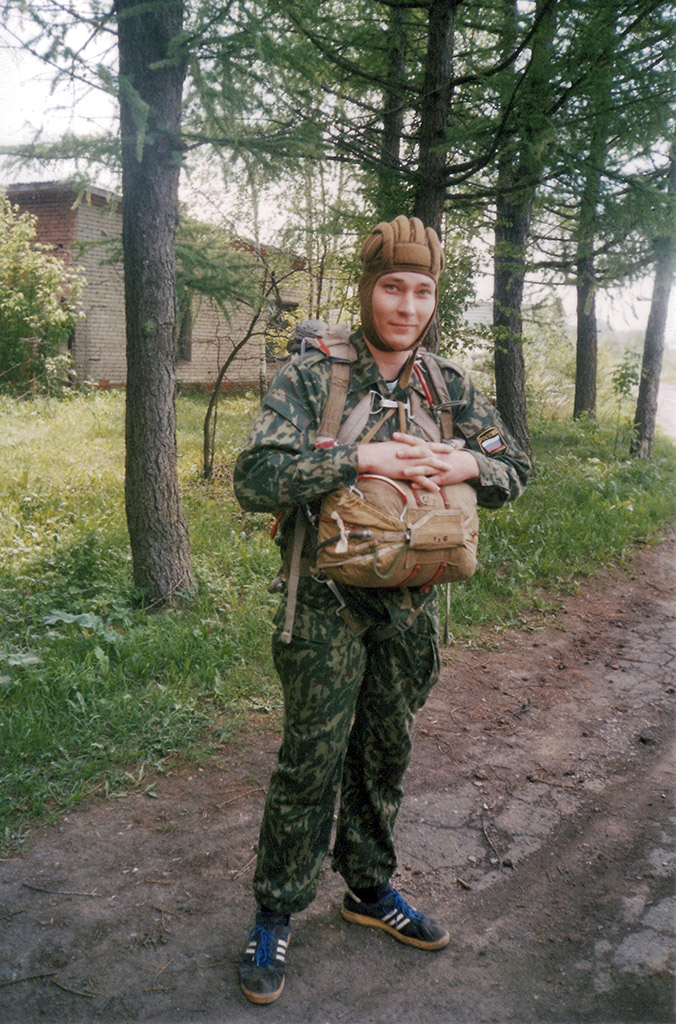 Полная экипировка парашютиста. Я стою слегка согнувшись, потому что для моего роста (185 сантиметров), распущенные по-максимуму лямки все-таки маловаты. У левого плеча – выкрашенное в красный цвет кольцо раскрытия парашюта. Чтобы при прыжке вы его не потеряли, к нему крепится резинка, в которую вы продеваете руку непосредственно перед прыжком. На запасном парашюте такое же кольцо.